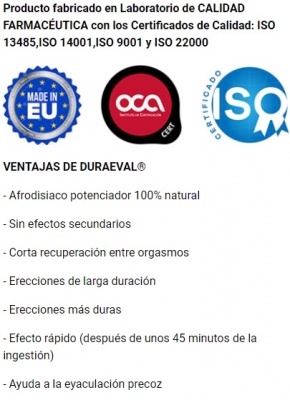 8. Duraeval es un potenciador sexual accesible sin receta médica, es un producto fabricado en Laboratorio de CALIDAD FARMACÉUTICA con los Certificados de Calidad: ISO 13485,ISO 14001,ISO 9001 y ISO 22000