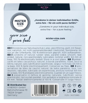 Con MISTER SIZE 64 tienes el condón que te proporciona una sensación agradable en todos los sentidos. ¡Los pellizcos, los pellizcos y la sensación de que te están ahogando la virilidad son cosa del pasado! A partir de ahora, comienza el puro placer. Justo antes de hacer el amor, se produce una maravillosa unión al colocarte fácilmente el condón en tu pene fuerte y robusto, una unión que generará maravillosos momentos de placer sensual. Ajuste fácil y perfecto con tu talla de condón personal No importa lo que haya sucedido en el pasado, ¡un condón siempre puede y debe ajustarse perfectamente! Con tu talla personal, tu condón MISTER SIZE abraza cálidamente tu pene como una segunda piel y hace posible una sensación natural. Ahora puedes relajarte y finalmente dejarte llevar por completo durante el sexo.