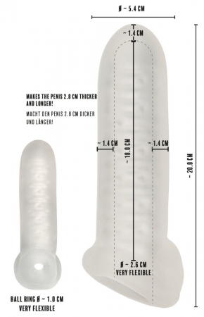 El pene ya es 1,3 cm más grueso y más largo Las ranuras interiores proporcionan una fricción estimulante y un ajuste antideslizante. El anillo testicular elástico proporciona una excitante tracción y garantiza que la funda se mantenga firmemente en su sitio.
